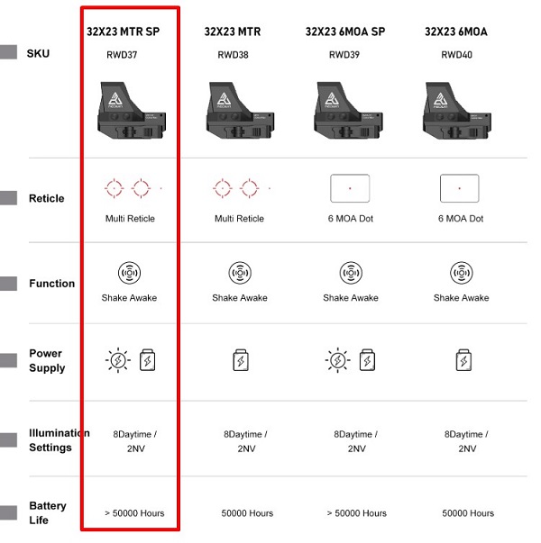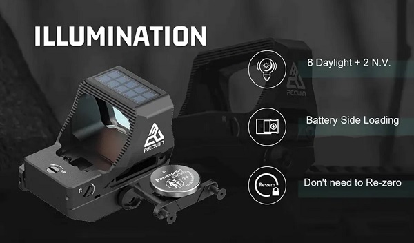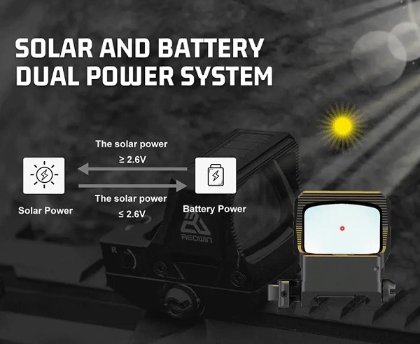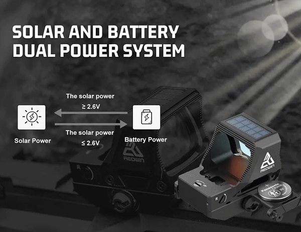 >50000 годин надзвичайно тривалого терміну служби батареї. З технологією безпеки сонячної енергії у разі виходу з ладу акумулятора. Мультиприцільна сітка, 8 рівнів червоного підсвічування + 2 рівні сумісні з приладами нічного бачення. Повністю ручне керування підсвічуванням + пробудження струшуванням, автоматичне вимкнення через 4 години.